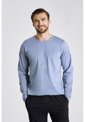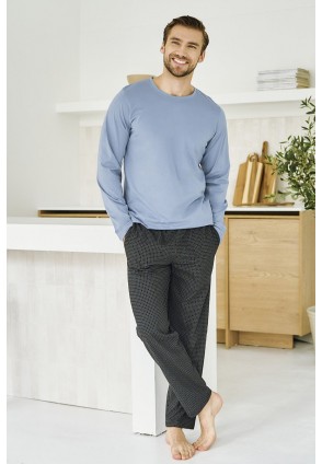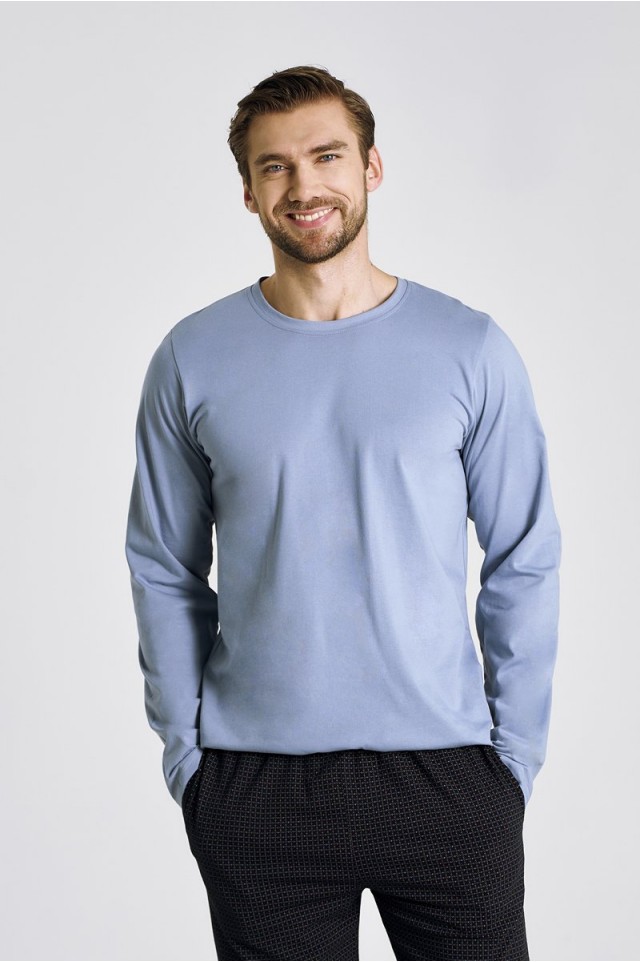 Хлопоквая мужская пижама со штанами. Однотонная футболка с длинным рукавом, круглый вырез. Длинные брюки с рисунком,