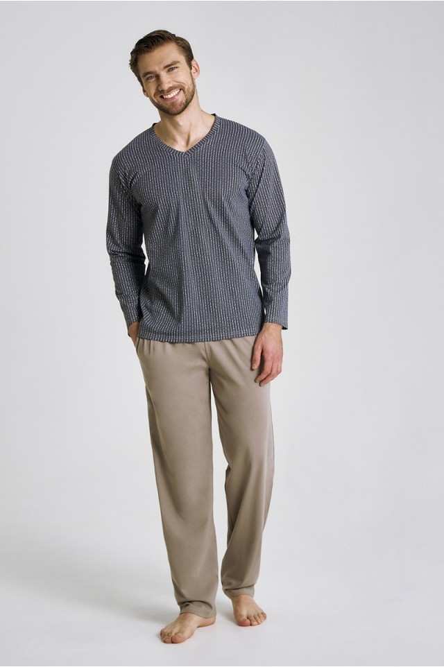 Пижама мужская со штанами. Лонгслив с длинными рукавами и рисунком, V-образный вырез горловины. Длинные однотонные брюки с карманами, эластичная резинка на талии.