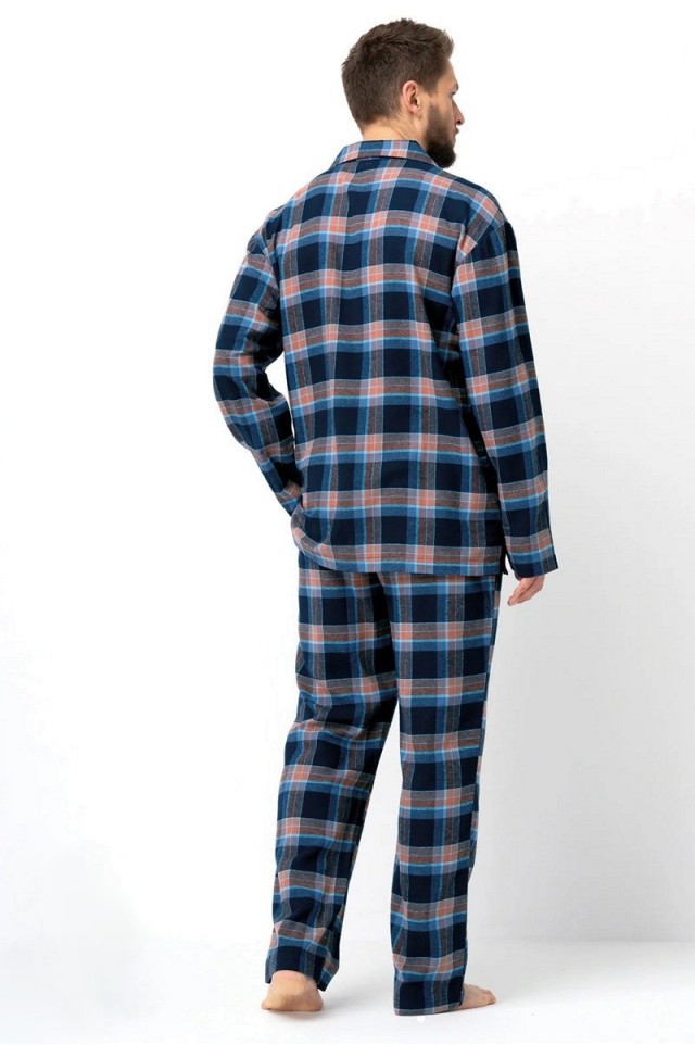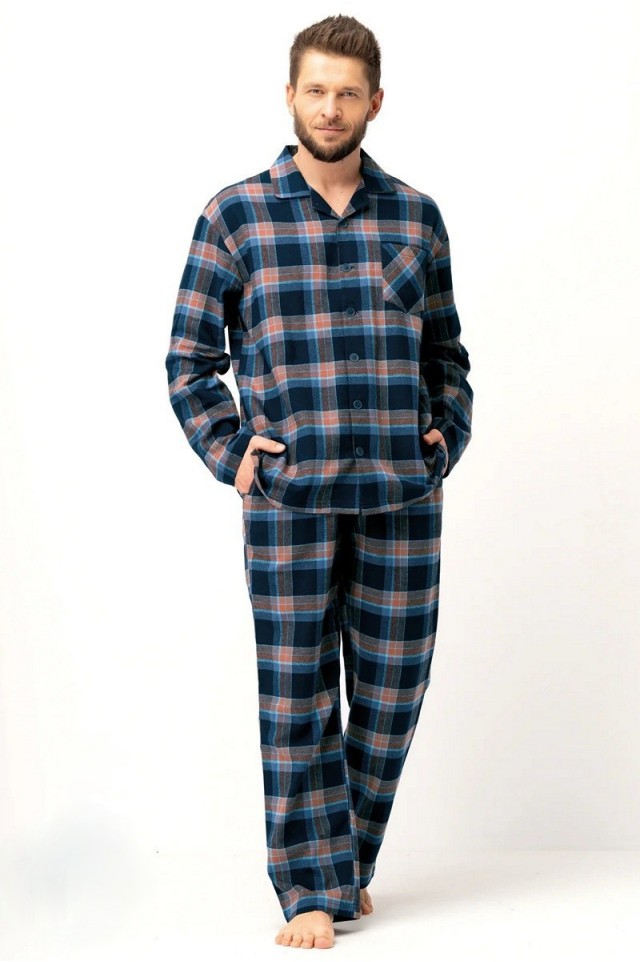 Классическая мужская фланелевая пижама. Оттенки коричневого, темно-синего и синего переплетаются в гармоничной композиции из клеток. Теплая и удивительно приятная на ощупь фланелевая ткань согреет ваше тело холодными зимними вечерами. Натуральная фланель поддерживает здоровье осенью и зимой. 100% высококачественные хлопковые волокна в сочетании с правильной строчкой и нитками обеспечивают прочное и долговечное использование. Классический крой, который можно застегнуть до самой шеи. Декоративный карман на груди. Классические прямые брюки с удобной, мягкой резинкой на талии. Глубокие карманы по бокам. Вечная элегантная пижама! Вся мягкая, дающая свободу вашему телу, обеспечивает спокойный, комфортный сон. Выкройка доступна в размерах от S до 4 XL!