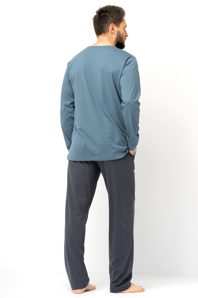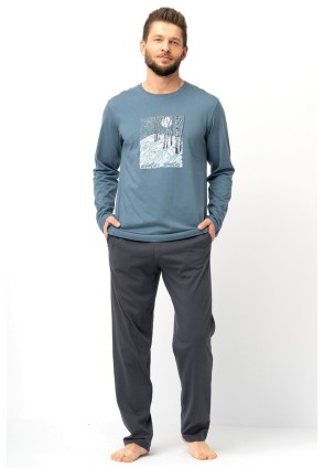 Классическая мужская пижама из мягкого и прочного трикотажа. 100% натуральное волокно обеспечивает тепло и очень высокий комфорт при ношении осенью и зимой. Приглушенный лонгслив с круглым вырезом украшен интересным рисунком лесного пейзажа. Гладкие брюки со слегка зауженными штанинами имеют удобную мягкую резинку на талии и глубокие карманы по бокам. Мягкий и приятный на ощупь хлопок — удобное предложение на все времена года. Очень удобный комплект, который также отлично подойдет в качестве домашней одежды. Модель доступна в размерах от S до 4 XL!