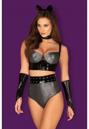 Игривый комплект Silveria выполнен из блестящей эластичной ткани в сочетании с тканью имитирующей кожу. Топ с мягкими чашками на косточках, на спинке очаровательная шнуровка, бретели регулируются по длине. Трусики-стринги с высокой посадкой. В комплект входят высокие митенки, чокер, и ободок с ушками. Комплект упакован в красивую плотную коробку и отлично подойдет в качестве оригинального подарка.
