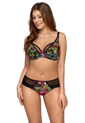 Бюстгальтер 1809 M на косточках, с дополнительными боковыми поддержками, чашки мягкие, внутренний слой чашек из чёрной гладкой ткани и сетки, внешний слой из гипюра с цветочным рисунком. Бретельки пришиты, регулируются по длине. На спине застёжка на удлинитель. Бюстгальтер идеально сочетается с трусиками 1808, 1809
