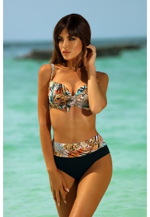 Раздельный купальник, арт. L2590/4 из тканей-компаньонов. Бюстгальтер с формованными эластичными чашками, со съемными пуш-ап вкладышами в полнотах B и C, на косточках, с дополнительными боковыми поддержками, бретельки регулируются по длине, на спине отстегиваются, на спине застежка. Фурнитура металлическая. Трусики слип на стрейч-подкладке, с посадкой выше среднего, на спинке присборены за счет резинки. Бюстгальтер и пояс у трусов выполнены из ткани с эффектом золотого мерцания.