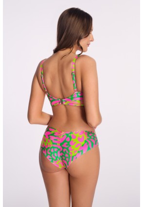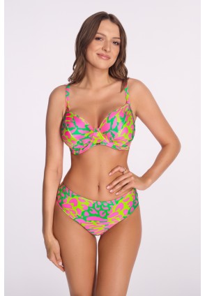 Бюстгальтер пляжный SK247 выполнен в цвете NEON SAFARI с шитыми мягкими чашками, на косточках, бретели регулируются по длине, на спине металлическая застёжка, фурнитура цвета желтого золота. Пояс продублирован стабилизирующей сеткой. Модель выполнена из ткани ярких тропических цветов – доминирующие неоново-розовый и лаймово-зеленый создают абстрактный, слегка анималистичный рисунок. Узор в флуоресцентных оттенках привлекает внимание и идеально дополняет летнюю атмосферу. Отлично сочетается с трусами SF246/2, SF247/5.