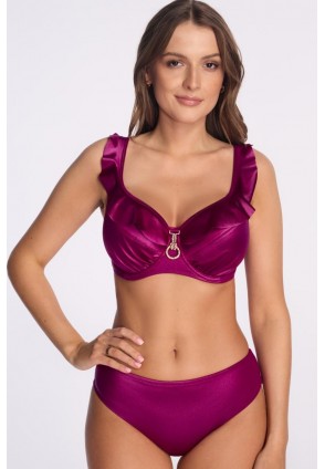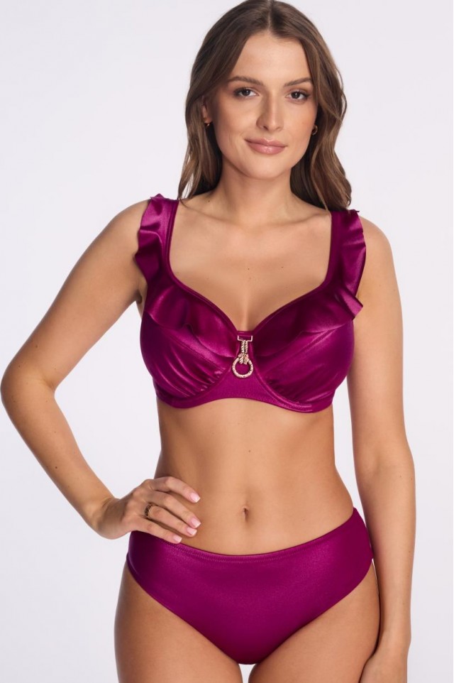 Бюстгальтер пляжный SK249 выполнен в цвете MAGENTA (фуксия) из слегка мерцающей ткани насыщенного цвета, которая прекрасно подчеркивает летний загар и эксклюзивность наряда, с мягкими шитыми чашками, на косточках, продублирован сеткой, тонкие бретели регулируются по длине, на спине металлическая застёжка, бретели и верх чашек декорированы рюшей, ажурная драпировка в нижней части чашек оптически подчеркивает грудь. Пояс продублирован стабилизирующей сеткой. Фурнитура металлическая цвета розового золота. Эффектная золотая подвеска с ювелирной деталью, расположенная по центру перемычки, служит дополнительным украшением, привлекая внимание и добавляя нотку элегантности. Отлично сочетается с трусами SF248/2, SF249/5.