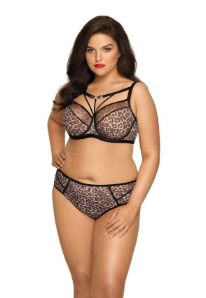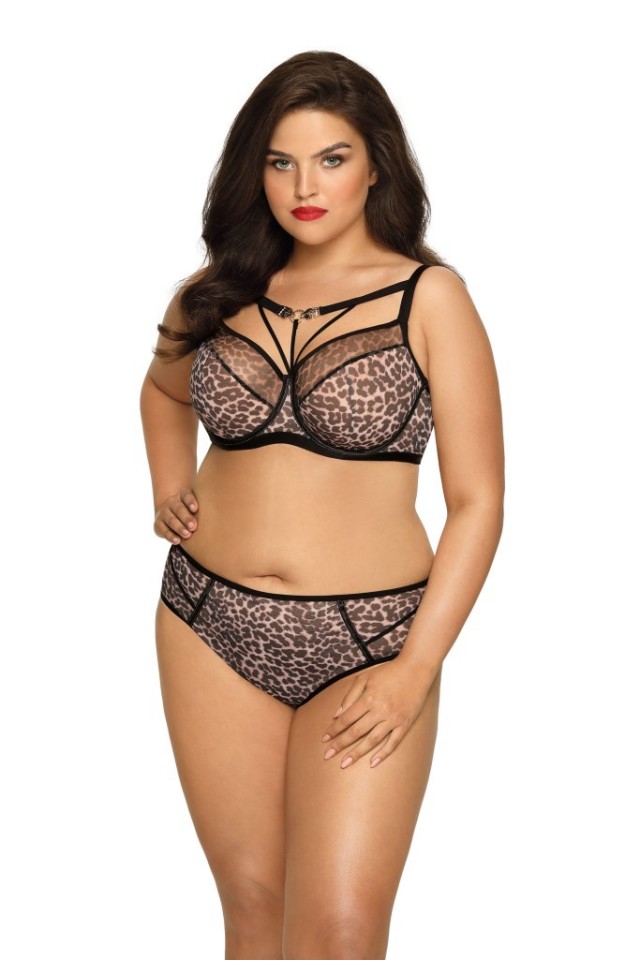 Бюстгальтер Stella №02 PU выполнен на косточках, чашки шитые, спинка и чашки из сетки расцветки гепард. Нижняя часть чашки из тонкого поролона телесного цвета, внутренняя сторона проложена хлопком. Окантовка косточек, бретели и резинки контрастного чёрного цвета. Бретельки бюста не отстёгиваются, регулируются по длине, в зоне декольте декоративные бретели с металлическим украшением в виде голов гепардов цвета золота, с кристаллами. На спине застёжка на удлинитель, количество крючков в ряду застёжки увеличивается пропорционально размеру бюстгальтера. Бюстгальтер идеально сочетается с трусиками Stella.