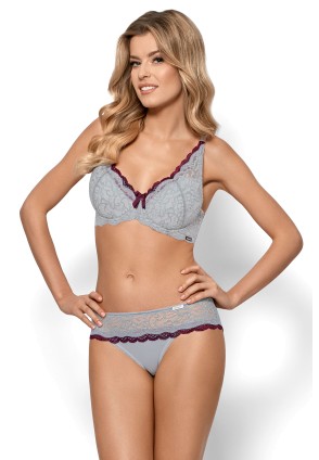 Трусики бразильяна Aurora из эластичного трикотажа и гипюра серого цвета, проймы ног украшены бордовым кружевом. Ластовица из 100% хлопка. Идеально сочетаются с бюстгальтерами Aurora.