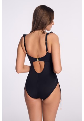 Совместный купальник SKJ71 для пляжного отдыха. Лиф купальника с шитыми мягкими чашками, на косточках, с внутренней стороны спереди купальник продублирован сеткой, под грудью пришита широкая резинка, на спине металлическая застёжка. Тонкие бретели регулируются по длине, бретели и верх чашек декорированы рюшей, между чашек золотая подвеска, ажурная драпировка в нижней части чашек оптически подчеркивает грудь. Регулируемые завязки по бокам позволяют индивидуально регулировать высоту, обеспечивая комфорт. Купальник отлично подойдет для пляжного отдыха и для похода в бассейн.Фурнитура металлическая цвета желтого золота.