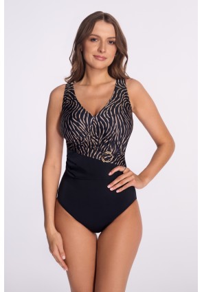 Купальник совместный арт. SKJ72 выполнен из высококачественной ткани: лиф купальника цвета DESERT NIGHT мягкий , на запах, к лифу пришиты поролоновые вкладыши, под грудью корректирующая резинка, широкие бретели разгружают позвоночник. Передняя часть купальника продумана до мелочей: вырез-запах деликатно обнажает грудь, создавая элегантный эффект. Мягкие сборки формируют верхнюю часть тела, золотистый ювелирный акцент на талии добавляет изысканности.