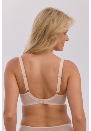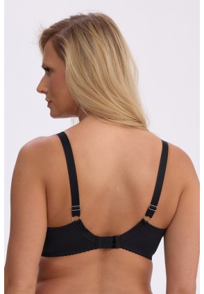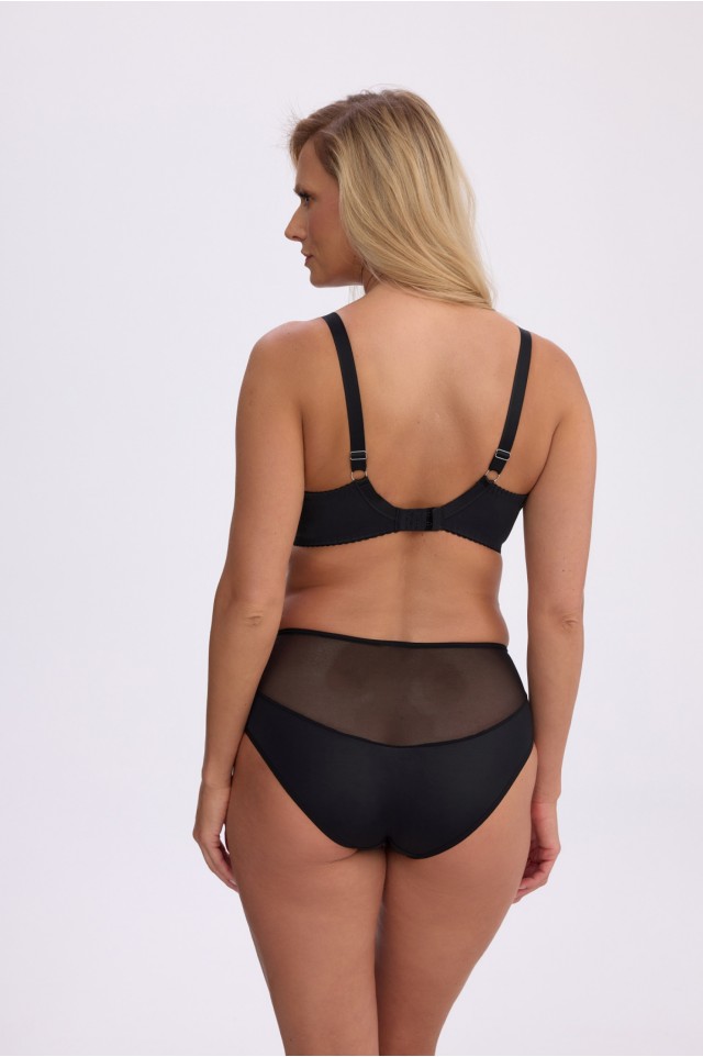 Бюстгальтер 001 Sara PU выполнен на косточках, чашки шитые, удлиненные до бретельки, нижняя часть на тонком поролоне, внутренняя сторона прошита хлопковым трикотажем, внешняя и верхняя часть чашки из тонкой сетчатой ткани, спинка из стабилизирующей сетки. Приподнятый срез нижней чашки закрывает сосок, середина бюстгальтера средней высоты, плотно прилегает к грудине, эластичный трикотаж и широкая резинка плотно собирают грудь и придают ей круглую форму. Бретельки не отстёгиваются, регулируются по длине, на спине застёжка - удлинитель на крючках, фурнитура металлическая. Отлично сочетается с трусами 001 Sara.