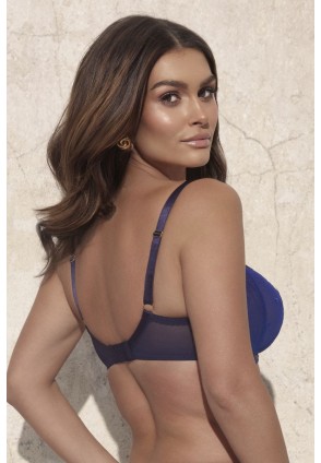 Мягкий бюстгальтер Foxy в 310 конструкции на кости выполнен из элегантной синей вышивки с нежным цветочным узором, который придает ему тонкую женственность. Передняя часть чашек дополнена прозрачной сеткой invisible, благодаря которой все выглядит легким и чувственным, а вышивка, кажется, почти плавает на коже. Характерным элементом является декоративная несъемная регулируемая полоса, проходящая через декольте в форме креста. Эта деталь привлекает внимание и придает бюстгальтеру современный модный вид, подчеркивая линию бюста и придавая образу выразительности. Несъемные бретели регулируются по всей длине, что обеспечивает идеальную посадку по фигуре и удобство ношения. В целом элегантность сочетается с современным дизайном, создавая эффектную и женственную модель нижнего белья. Золотые детали.