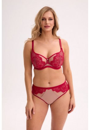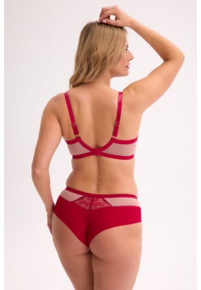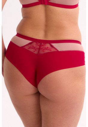 Трусики бразильяна 1274 Frida со средней линией талии выполнены в красном цвете из кружевного полотна и мягкой телесной сетки, со вставками из телесной микрофибры, на спинке проймы ног из красной сетки, сложенной вдвое. Ластовица из 100% хлопка. Идеально сочетаются с бюстгальтерами 1273 Aina, 1274 Frida.