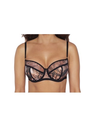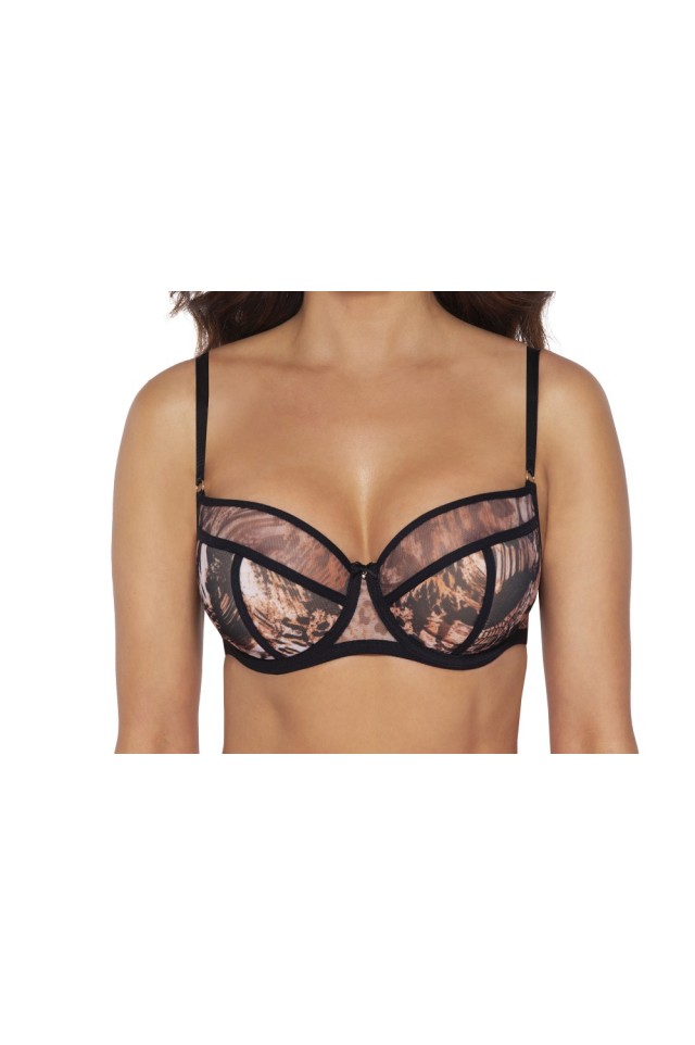 Бюстгальтер 2029 в цвете Wild black (Дикий черный) выполнен на косточках, чашки шитые, нижняя часть на тонком поролоне телесного цвета, внешняя и верхняя часть чашки, и спинка из сетки с хищным принтом. Резинки, окантовка косточек, бретели контрастного черного цвета. Бретельки регулируются по длине, не отстёгиваются. На спине застёжка на удлинитель, количество крючков в ряду застёжки увеличивается пропорционально размеру бюстгальтера. Фурнитура металлическая цвета желтого золота. Бюстгальтер идеально сочетается с трусиками из коллекции 2028, 2029, 2030.
