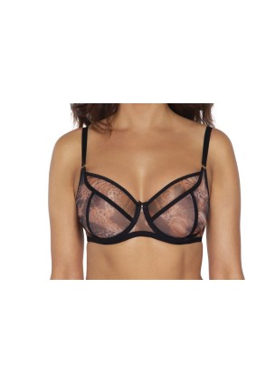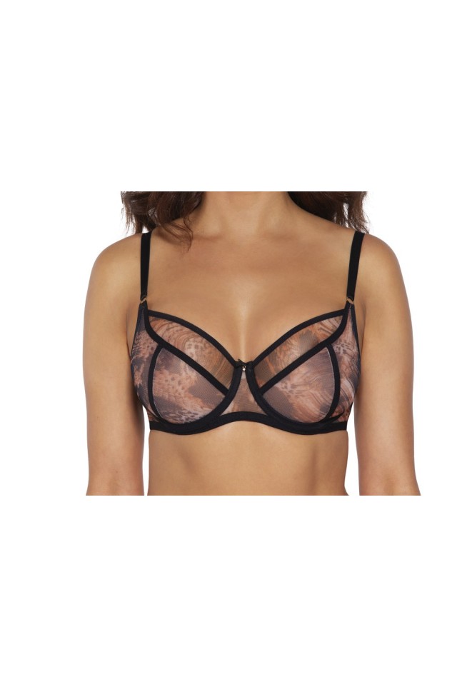 Бюстгальтер 2030 в цвете Wild black (Дикий черный) выполнен с шитыми мягкими чашками на косточках, чашки и спинка из сетки с хищным принтом. Резинки, окантовка косточек, бретели контрастного черного цвета. Бретельки регулируются по длине, не отстёгиваются. На спине застёжка на удлинитель, количество крючков в ряду застёжки увеличивается пропорционально размеру бюстгальтера. Фурнитура металлическая цвета желтого золота. Бюстгальтер идеально сочетается с трусиками из коллекции 2028, 2029, 2030.