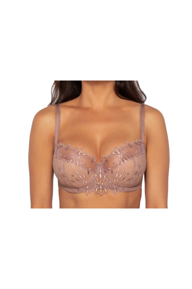 Бюстгальтер АVA 2034 PU выполнен в цвете Coffee Rose на основе модели 1030, на косточках, чашки шитые, нижняя часть на тонком поролоне телесного цвета, внутренняя сторона прошита хлопковым трикотажем, внешняя и верхняя часть чашки из сетки с вышивкой. Бретельки не отстёгиваются, регулируются по длине, на спине застёжка - удлинитель на крючках, фурнитура металлическая цвета меди. Пояс из стабилизирующей сетки. Бюстгальтер идеально комплектуется трусиками арт. 2034, 2035.