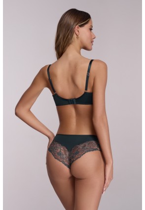 Бюстгальтер АVA 2174 PU выполнен на основе бюста 1030 в цвете Azure (лазурный) на косточках, чашки шитые, нижняя часть с тонким телесным поролоном, внутренняя сторона прошита хлопковым трикотажем, верхняя часть из тонкой телесной сетки, внешняя сторона чашек отделана искусно сотканным изумрудным кружевом, украшенным золотым цветочным узором. Пояс из корректирующей сетки. Бретельки не отстёгиваются, регулируются по длине, на спине застёжка - удлинитель на 2-3 крючка, фурнитура металлическая цвета розового золота. Бюстгальтер идеально комплектуется трусиками арт. 2174, 2175.