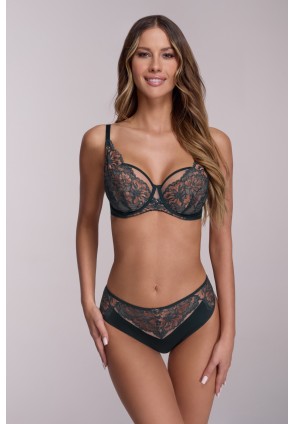 Бюстгальтер АVA 2175 M выполнен на основе бюста 1130 в цвете Azure (лазурный) на косточках, чашки мягкие, шитые из тонкой телесной сетки, внешняя сторона чашек покрыта искусно сотканным изумрудным кружевом, украшенным золотым цветочным узором. Идеально скроенные чашки с боковой вставкой красиво формируют бюст, деликатно прикрывая соблазнительные женственные формы. Пояс из корректирующей сетки. Бретельки не отстёгиваются, регулируются по длине, на спине застёжка - удлинитель на 2-3 крючка, фурнитура металлическая цвета розового золота. Бюстгальтер идеально комплектуется трусиками арт. 2174, 2175.
