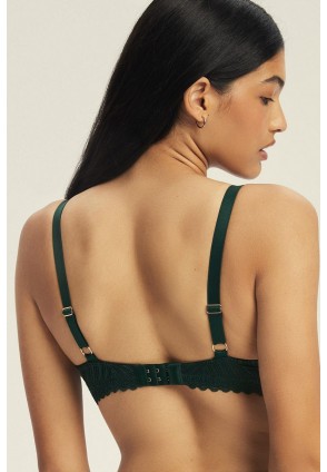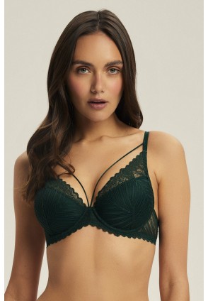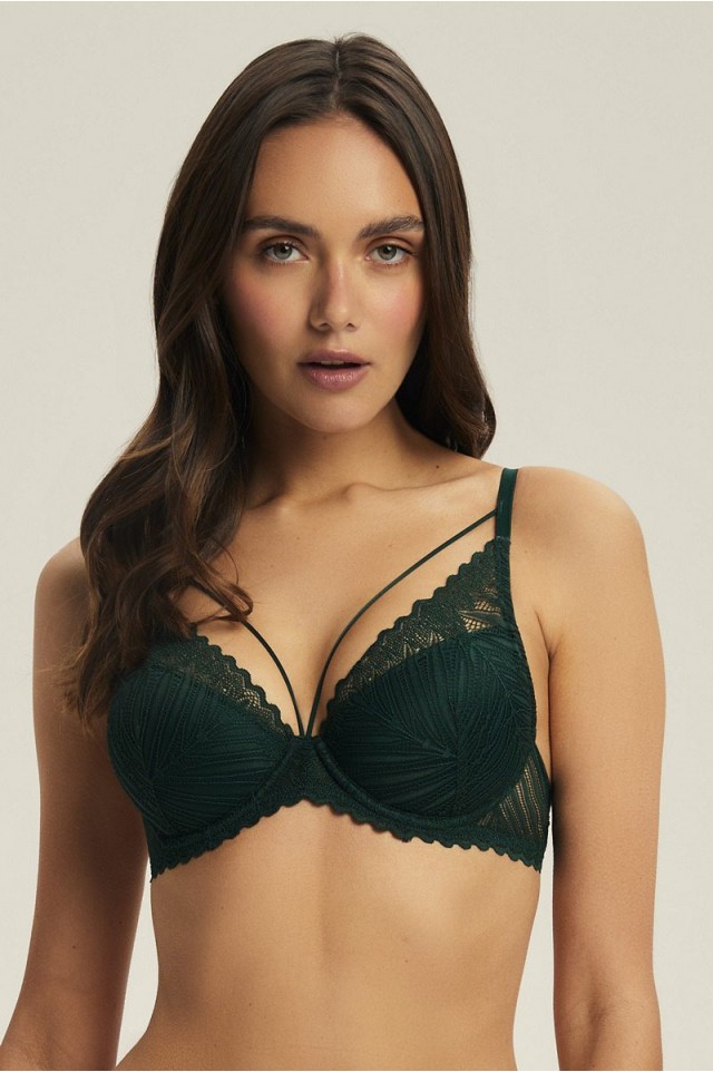 Кружевной бюстгальтер от европейского производителя Esotiq. Поролоновая чашка на кости со съемным пуш-ап. На базе Kassidy. Несъемные регулируемые бретели. Спереди несъемный стреп. Золотые детали. Внутренняя поверхность чашек хлопковая. Состав: кружево 88% полиамид, 12% эластан; сетка 75% полиамид, 25% эластан; подклад чашки 100% хлопок.