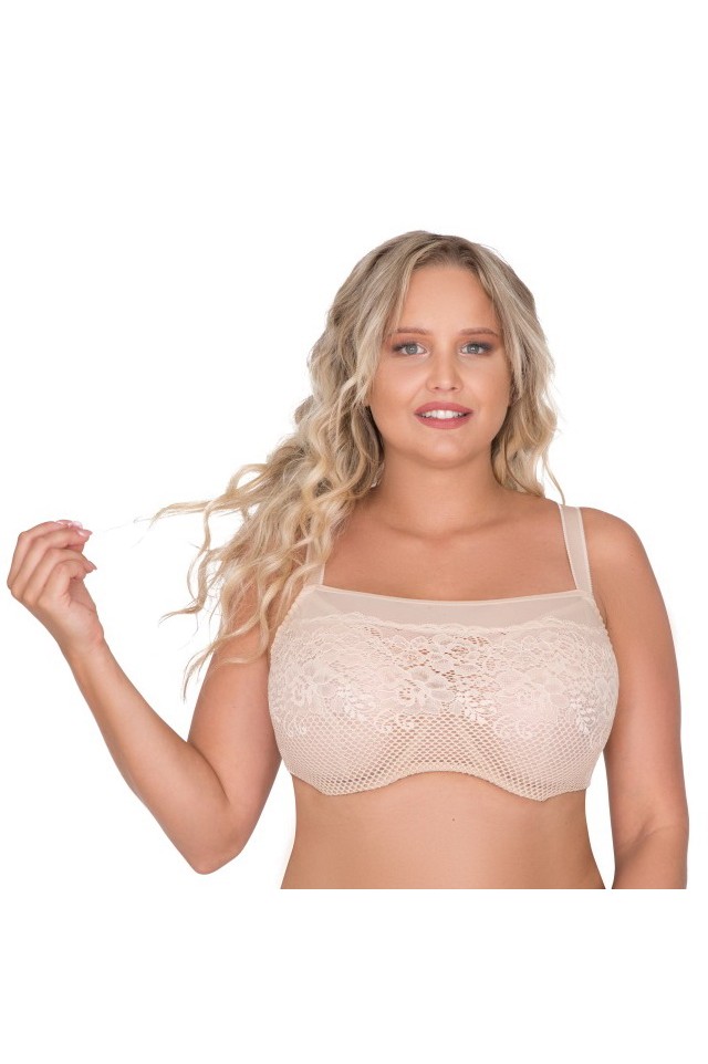 Бюст-топ A-47 мягкий, на косточках, с дополнительными боковыми поддержками, чашки шитые из сетки, снаружи из кружевного полотна, бретельки пришиты, регулируются по длине, на спине застёжка-удлинитель, фурнитура металлическая.