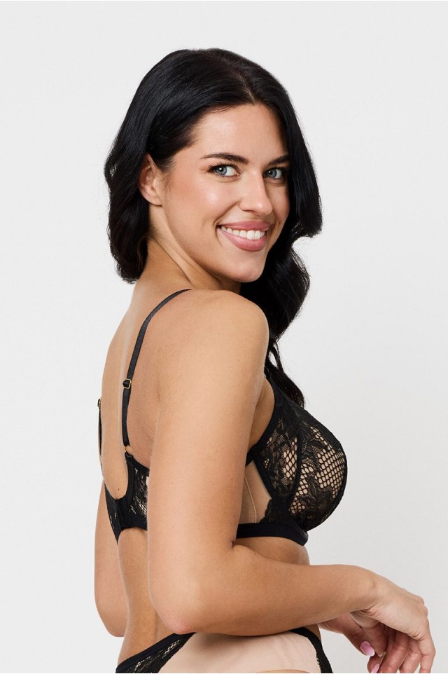 Бюстгальтер BELINDA BLACK от европейского производителя Subtille. Мягкая чашка на кости, конструкция чашки S-05 (чашка c боковым подкроем). Несъемные регулируемые бретели. Выполнен из кружева и тонкой микросетки. Золотые аксессуары.