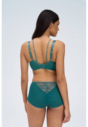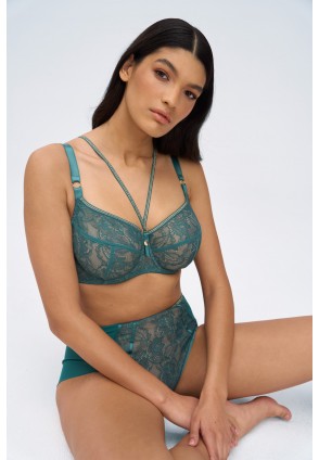 Бюстгальтер из коллекции Chiara M выполнен в насыщенном летнем зелёном цвете с глубокими голубыми оттенками с мягкими чашечками на косточках, чашки шитые, из кружева, продублированы телесной сеткой, декорированы тесьмой в тон. Спинка из двух слоев стабилизирующей сетки. Бретельки регулируются по длине, не отстёгиваются. В зоне декольте дополнительные съемные тонкие бретели, регулируются по длине, крепятся между чашками и на спинке, при желании их можно перекрещивать на спине. На спине застёжка на удлинитель, количество крючков в ряду застёжки увеличивается пропорционально размеру бюстгальтера, фурнитура металлическая цвета желтого золота. Золотая люрексовая нить проходит через всю коллекцию, добавляя ей утончённого блеска и благородства. Бюстгальтер идеально сочетается с трусиками из коллекции Chiara.