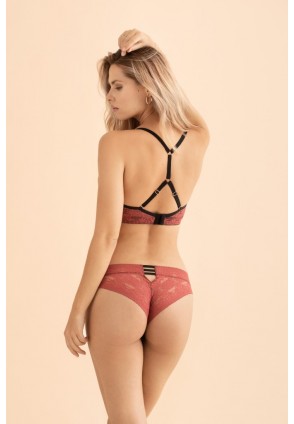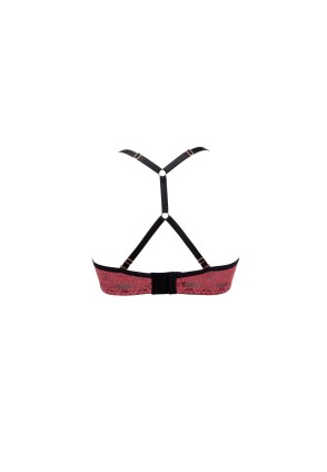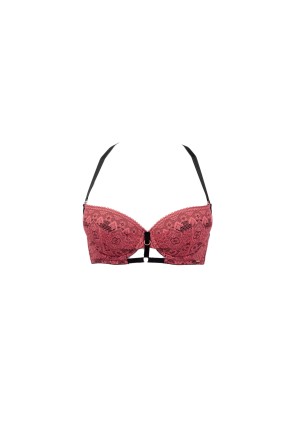 Бюстгальтер Goji на косточках, с дополнительными боковыми поддержками, чашки шитые на тонком поролоне черного цвета, со съёмными пуш-ап вкладышами, внутренняя сторона проложена хлопковым трикотажем, внешняя покрыта розовым кружевом. Бретельки красивые, декоративные, съёмные, регулируются по длине. На спине застёжка на удлинитель, количество крючков в ряду застёжки, увеличивается пропорционально размеру бюстгальтера. Бюстгальтер идеально сочетается с трусиками Goji.