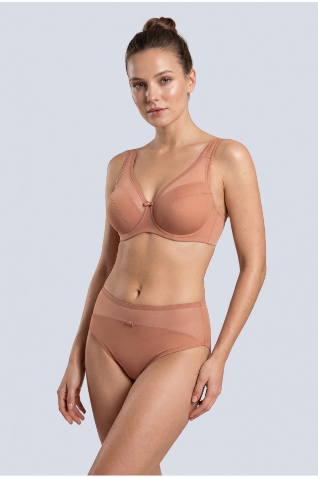 Бюстгальтер Havana M в цвете mocha mousse выполнен с мягкими чашечками на косточках, чашки шитые эластичной микрофибры, нижняя часть продублирована хлопковым трикотажем, верхняя часть из эластичной сетки, пояс из микрофибры. Бретельки регулируются по длине, не отстёгиваются, на плечах с тонким поролоном. На спине застёжка на удлинитель, количество крючков в ряду застёжки увеличивается пропорционально размеру бюстгальтера, от 1 до 3 крючков, фурнитура металлическая цвета розового золота.