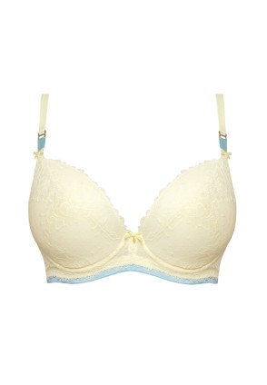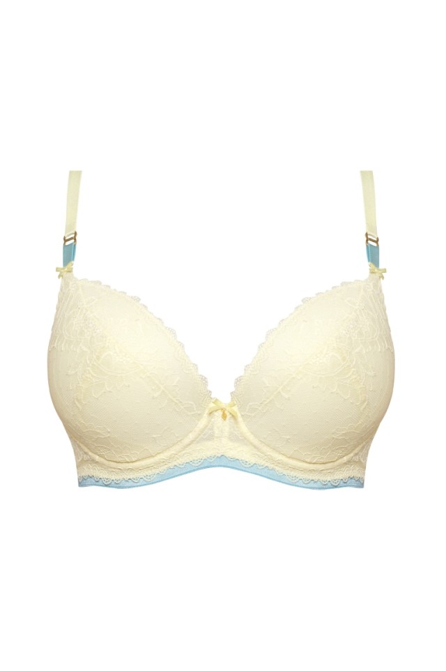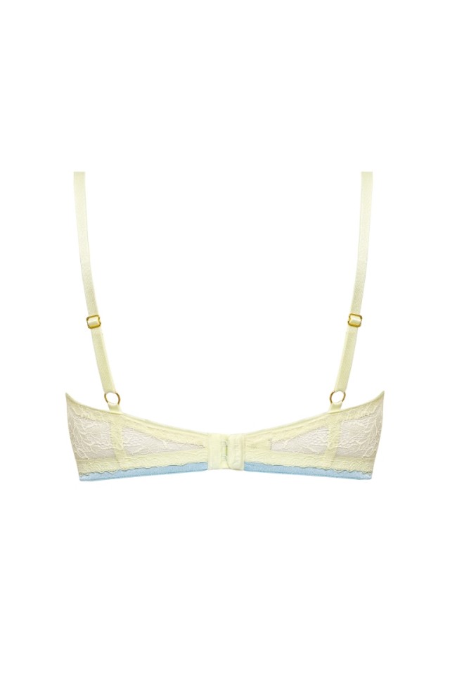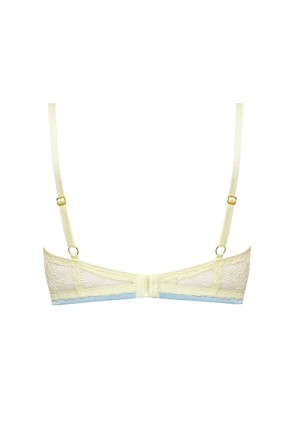 Бюстгальтер Ilona push up на косточках, с дополнительными боковыми поддержками, чашки шитые, на тонком поролоне, со съёмными пуш-ап вкладышами, внутренняя сторона проложена хлопковым трикотажем, внешняя сторона чашек и спинка из жёлтого кружева, по стану бюстгальтера пристрочена голубая резинка. Бретельки отстёгиваются на спинке, регулируются по длине. На спине застёжка на удлинитель, количество крючков в ряду застёжки, увеличивается пропорционально размеру бюстгальтера. Бюстгальтер идеально сочетается с трусиками Ilona.