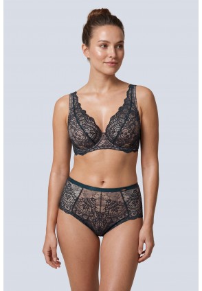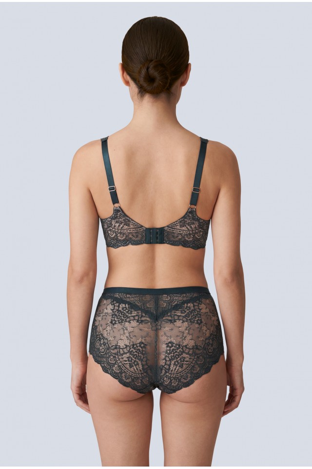 Бюстгальтер бралетт из коллекции Marea M выполнен с мягкими чашечками на косточках (на каркасах), с дополнительными боковыми поддержками, чашки шитые из роскошного кружева с цветочным рисунком, продублированы неэластичной телесной сеткой. Бретельки регулируются по длине, не отстёгиваются. На спине застёжка на удлинитель, количество крючков в ряду застёжки увеличивается пропорционально размеру бюстгальтера, пояс кружевной продублирован сетчатой тканью телесного цвета. Фурнитура металлическая. Бюстгальтер идеально сочетается с трусиками из коллекции Marea.