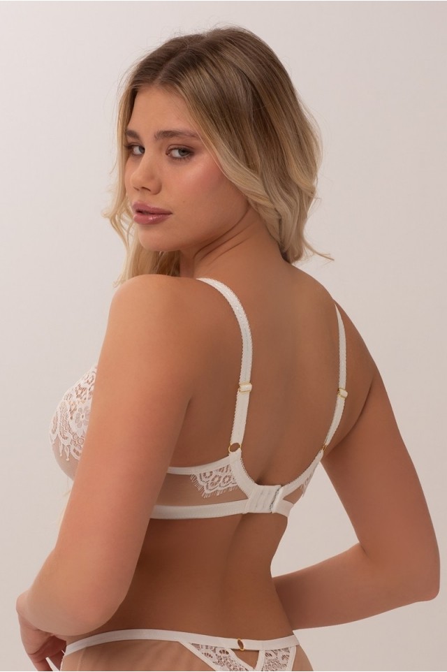 Бюстгальтер MARTA Sof от европейского производителя Subtille. Выполнен из нежной микросетки и кружева. Мягкая чашка на кости в конструкции S-01, не глубокий, балконированный, конструкция Aquamarine. Несъемные регулируемые бретели. Золотые детали. Фирменный логотип Subtille.