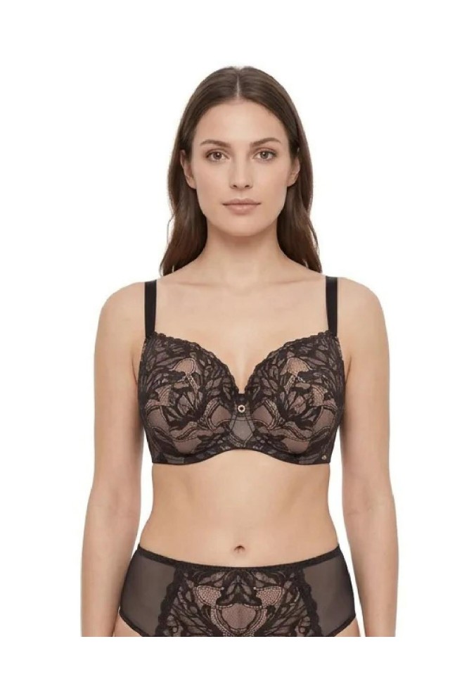 Бюст Molto PU выполнен на косточках (на каркасах), с дополнительными боковыми поддержками, чашки шитые, нижняя часть на тонком поролоне телесного цвета, с внешней стороны из кружева, внутренняя сторона проложена хлопковым трикотажем, верхняя часть кружевная, продублирована телесной сеткой. Бретельки не отстёгиваются, регулируются по длине, фурнитура металлическая цвета розового золота. Спинка из черной сетки продублирована телесной сеткой. На спине застёжка на удлинитель, количество крючков в ряду застёжки, увеличивается пропорционально размеру бюстгальтера. Бюстгальтер идеально сочетается с трусиками Molto.