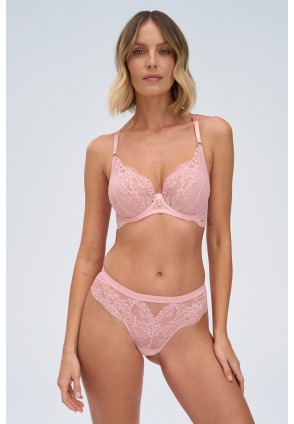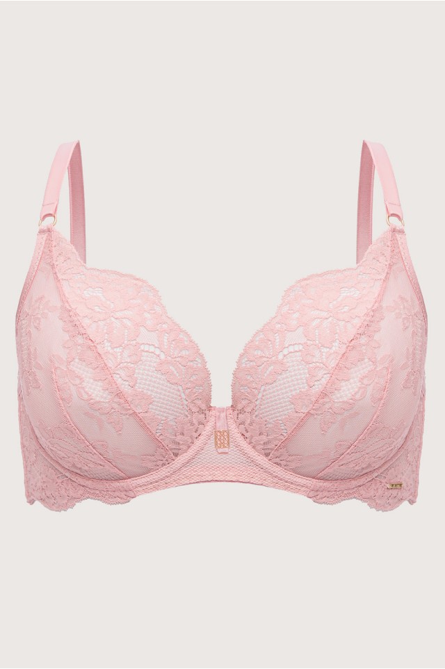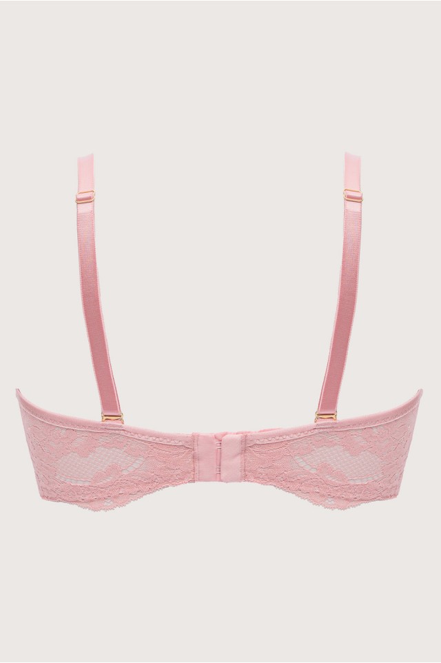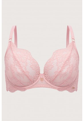 Романтичный бюстгальтер Powder Whisper с чашками на каркасах. Сбоку дополнительная боковая косточка. Чашки покрыты цветочным кружевом розового цвета. Бретельки регулируются по длине, на спине застежка на крючки-петли. Свод чашек декорирован украшением в виде медальона.