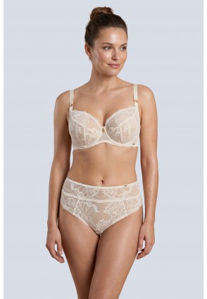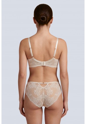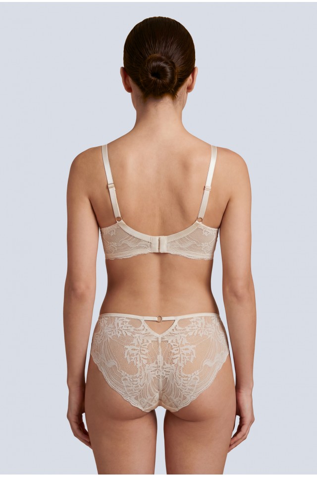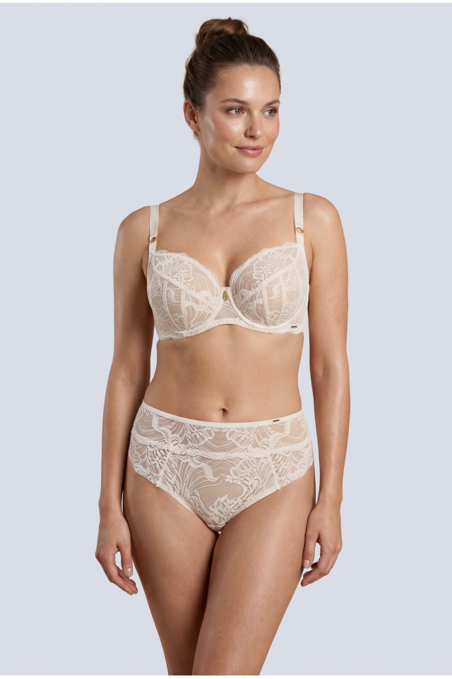 Бюстгальтер PureRomantic M выполнен на основе бюста The Icon M в цвете vanilla на косточках, с дополнительными боковыми поддержками, чашки шитые из нежного кружева, продублированы сеткой. Спинка из кружева продублирована сеткой. Бретельки не отстёгиваются, регулируются по длине. На спине застёжка на удлинитель, фурнитура металлическая цвета желтого золота. Бюстгальтер идеально сочетается с трусиками PureRomantic.