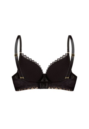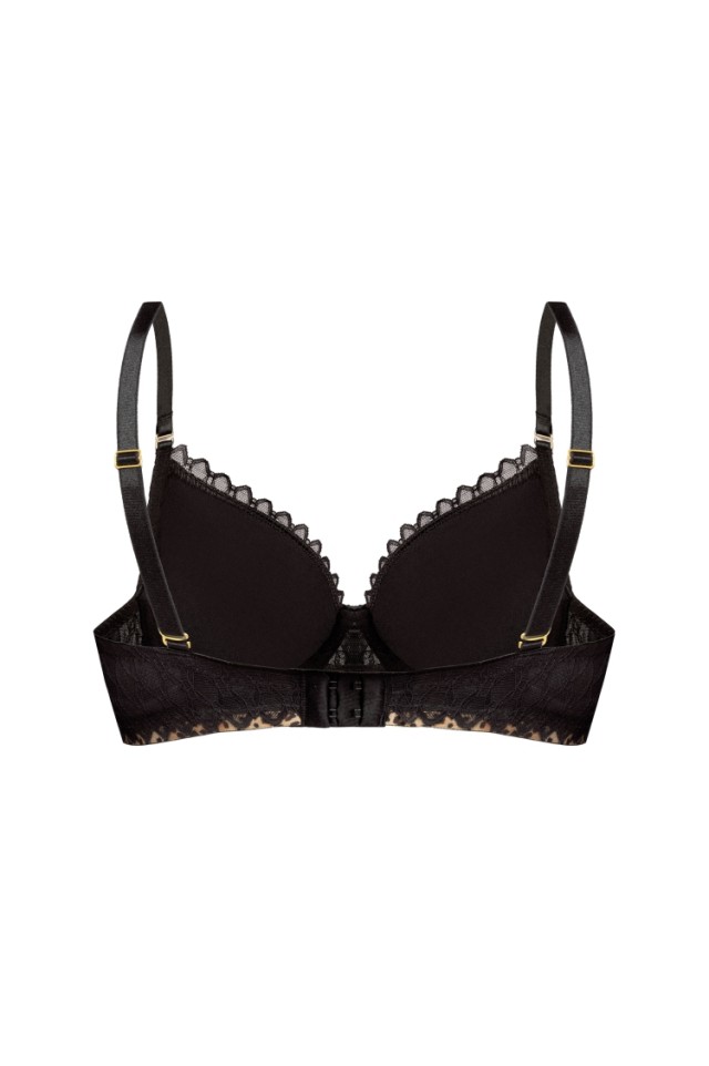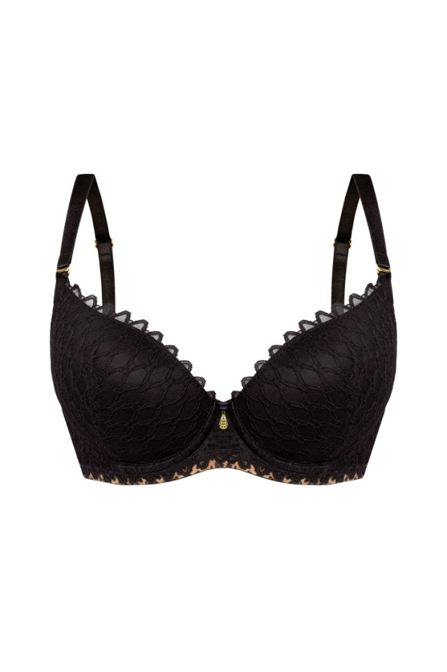 Бюстгальтер Tristane push up: чашки формованные с несъёмным силиконовым пуш-апом, на косточках, с дополнительными боковыми поддержками, внешняя сторона чашек и спинка из сетки с фантазийным рисунком, спинка продублирована черной сеткой, под чашками пришита резинка с хищным принтом. Бретельки отстёгиваются, регулируются по длине. На спине застёжка на удлинитель, фурнитура металлическая цвета желтого золота. Бюстгальтер идеально сочетается с трусиками из коллекции Tristane. На модели бюстгальтер размера 70E.