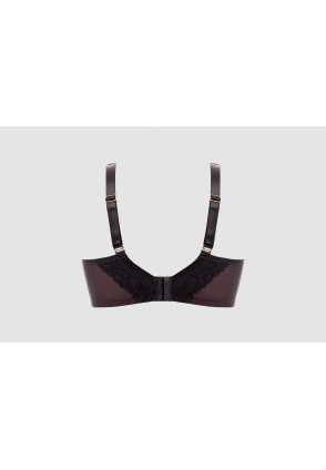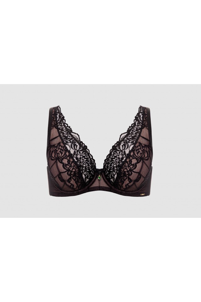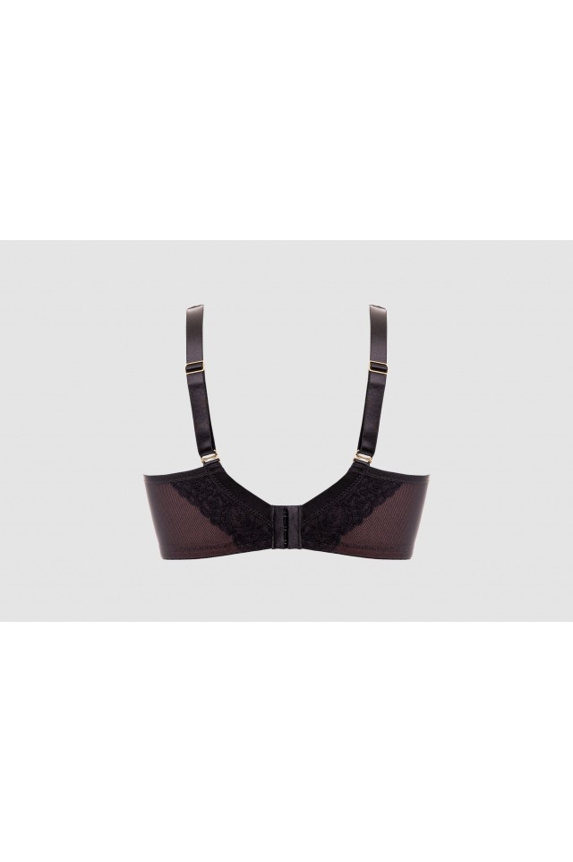 Бюстгальтер-бралетт из коллекции TruffleNoir выполнен на основе бюста Sublime с мягкими, шитыми из роскошного черного кружева чашками, продублированными сеткой цвета трюфеля, на косточках, с дополнительными боковыми поддержками. Пояс из черной сетки продублирован сеткой цвета трюфеля. Широкие бретели с подкладкой из мягкого пеноматериала регулируются по длине, не отстёгиваются. На спине застёжка на удлинитель, количество крючков в ряду застёжки увеличивается пропорционально размеру бюстгальтера, фурнитура металлическая цвета желтого золота. Бюстгальтер идеально сочетается с трусиками из коллекции TruffleNoir.