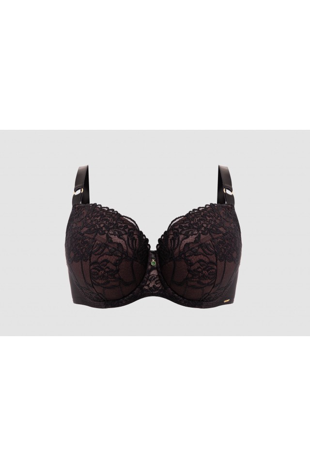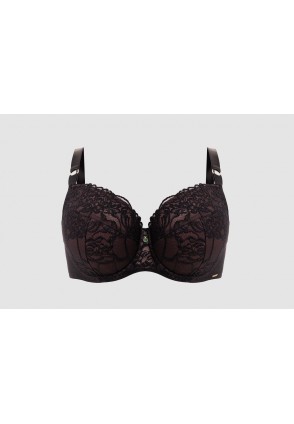 Бюстгальтер TruffleNoir PU выполнен на основе бюста Sublime, на косточках (на каркасах), с дополнительными боковыми поддержками, чашки шитые, нижняя часть на тонком поролоне цвета трюфеля, внутренняя сторона проложена хлопковым трикотажем, внешняя и верхняя часть чашки из кружевного полотна, спинка из черной продублирована сеткой цвета трюфеля. Бретельки не отстёгиваются, регулируются по длине. На спине застёжка на удлинитель, количество крючков в ряду застёжки, увеличивается пропорционально размеру бюстгальтера, фурнитура металлическая цвета желтого золота. Бюстгальтер идеально сочетается с трусиками TruffleNoir.