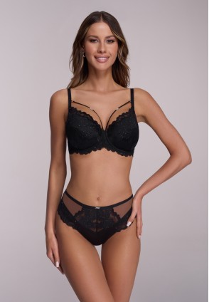 Трусики бразильяна со средней линией талии АVA 2154 FIESTA выполнены в черном цвете: спинка из эластичного трикотажного полотна, спереди из сетки и кружева, проймы ног из кружева. Восхитительное, мерцающее серебристым, кружево изящно смотрится на загорелой коже. Ластовица проложена 100% хлопком. Трусики идеально комплектуются с бюстгальтером арт. 2153, 2154, 2155.