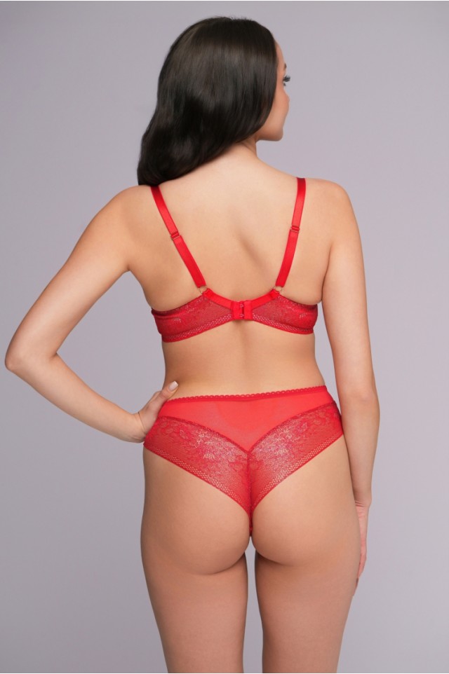 Трусики бразильяна со средней линией талии АVA 2252 выполнены из огненно-красного блестящего кружева, спереди V-образная вставка из сетки, на спинке V-образная вставка из красной сетки. Ластовица проложена 100% хлопком. Трусики идеально комплектуются с бюстгальтером арт. 2127, 2128, 2252.
