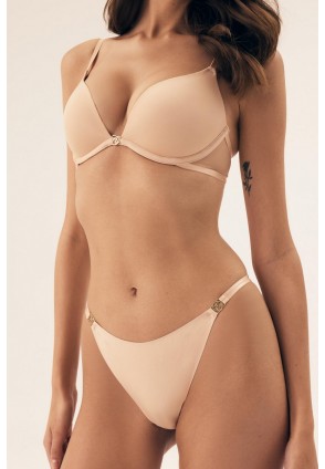 Стринги Nuts в золотисто-коричневом оттенке. Они мягко обвивают тело, подчеркивая изгибы и создавая гладкую линию бедер. Их сверхлегкая структура обеспечивает мягкость на ощупь и воздухопроницаемость, благодаря чему модель отлично подходит для повседневной носки. Материал передней части стринг выполнен из ультралегкой нежной микрофибры, тем временем как задняя часть из прозрачного близкого к телу микротюля. Хлопковая ластовица.