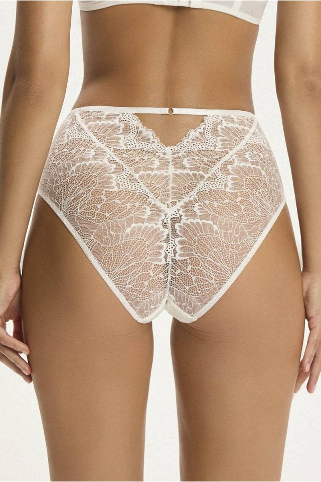Трусы с высокой посадкой Crown. Прозрачная вставка на поясе сочетается с богатым растительным узором, который красиво контрастирует с кожей. Скосы спереди ведут линию к центру и визуально выпячивают бёдра, а скошенный сзади вырез рисует на теле элегантный контур в форме буквы V. Неглубокая вытачка сзади придает образу современный вид и деликатно подчеркивает талию. Хлопковая ластовица.