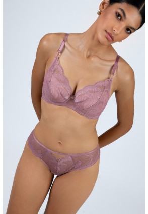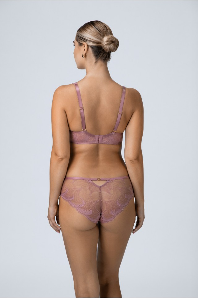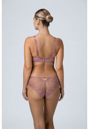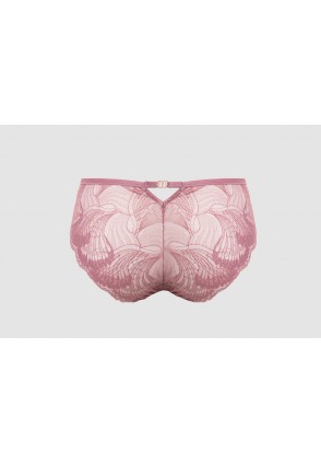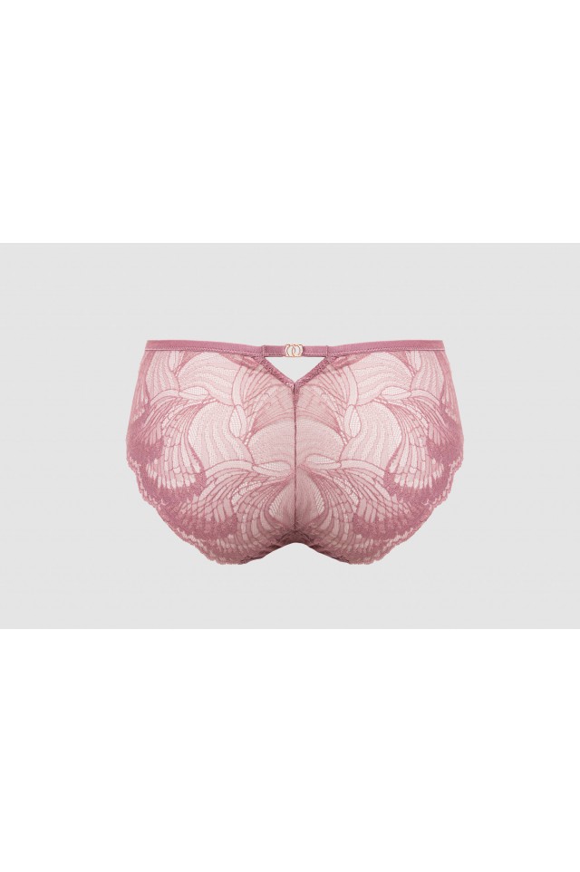 Трусики слип из коллекции EssenzaRosa выполнены из кружева, спереди продублированы сеткой, на спинке V-образный вырез, фурнитура металлическая цвета розового золота. Ластовица проложена 100% хлопком.