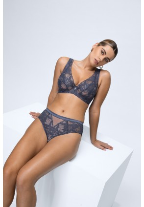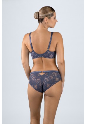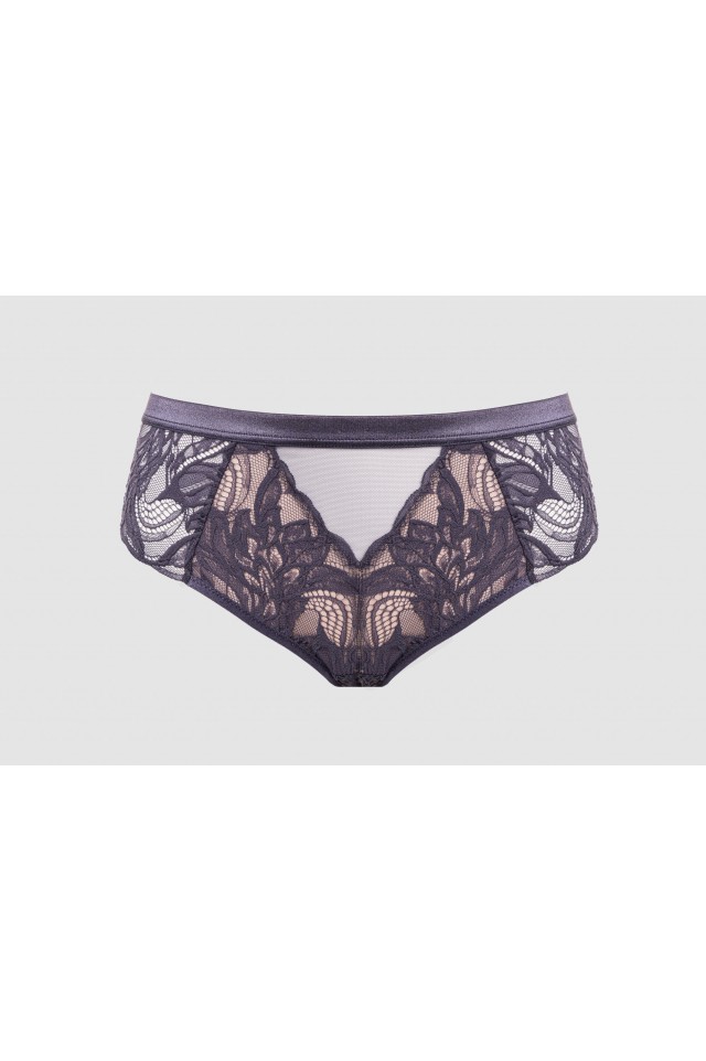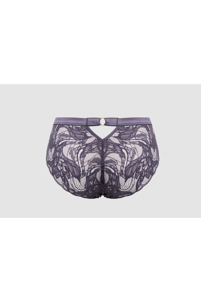 Трусики слип из коллекции LuceViola выполнены из кружева, спереди V-образная вставка из сетки в тон, кружево продублировано телесной сеткой, на спинке V-образный вырез, фурнитура металлическая цвета розового золота. Ластовица проложена 100% хлопком телесного цвета.