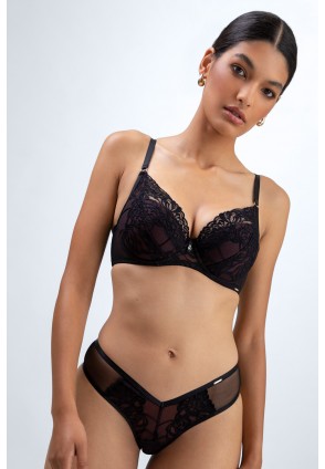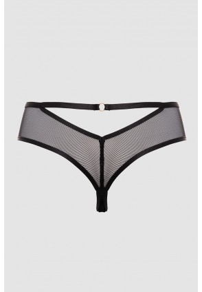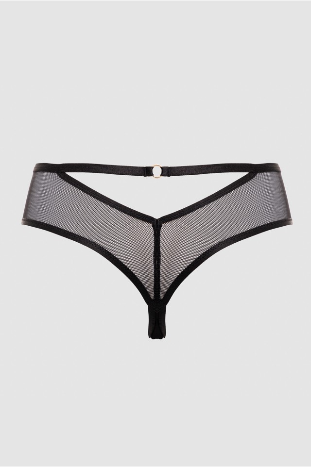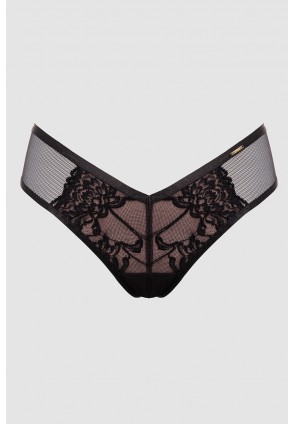 Кружевные трусики-стринги Truffle Noir средней посадки. Выполнены из эластичной сетки и ажурного кружева. Ластовица хлопковая.