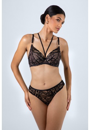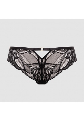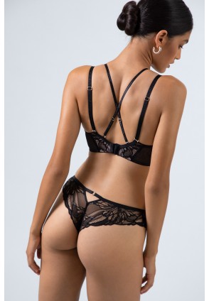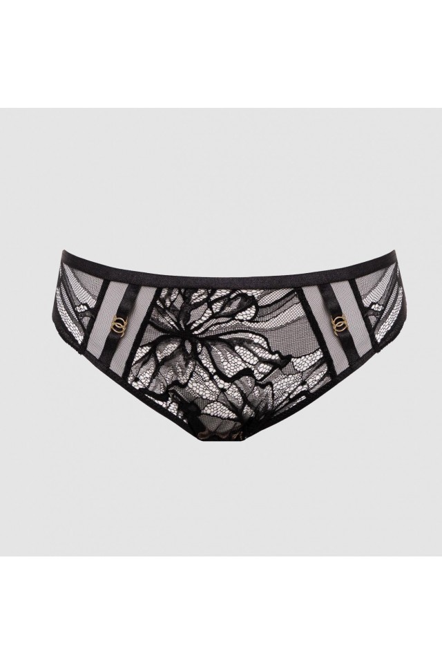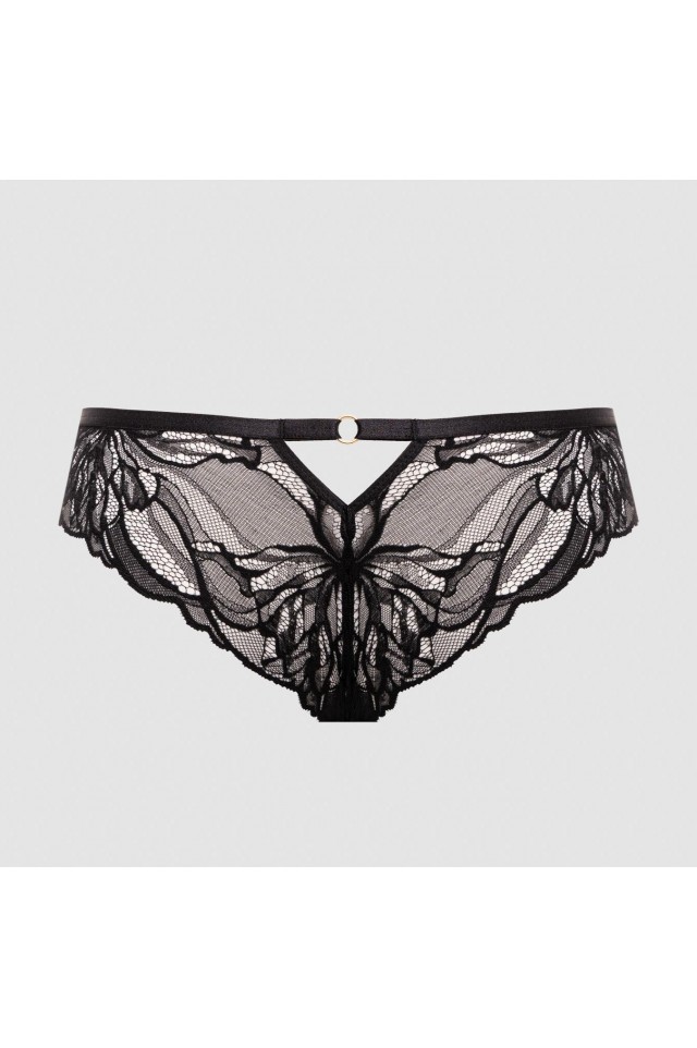 Трусики бразильяна из коллекции The Icon выполнены из кружева, на спинке V-образный вырез, фурнитура металлическая цвета желтого золота. Ластовица проложена 100% хлопком телесного цвета.