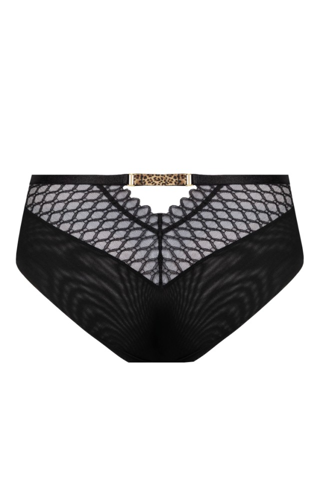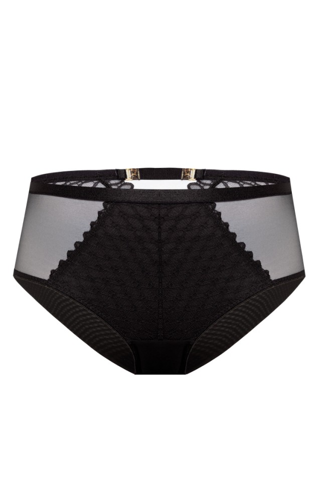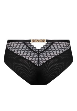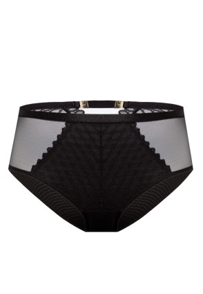 Трусики лип Tristane с завышенной линией талии выполнены из кружевного полотна с фантазийным рисунком, спереди продублированы черной сеткой, по бокам вставки из черной сетки, на спинке V-образный вырез с резинкой с хищныым принтом, фурнирута металлическая цвета желтого золота, проймы ног из сетки, сложенной вдвое, ластовица из 100% хлопка. Трусики идеально комплектуются с бюстгальтерами Tristane.