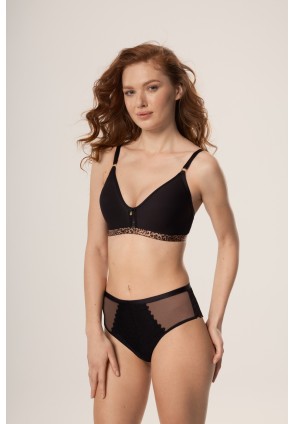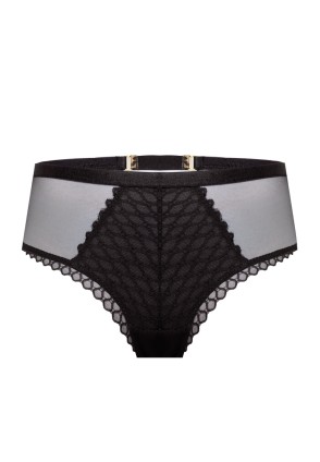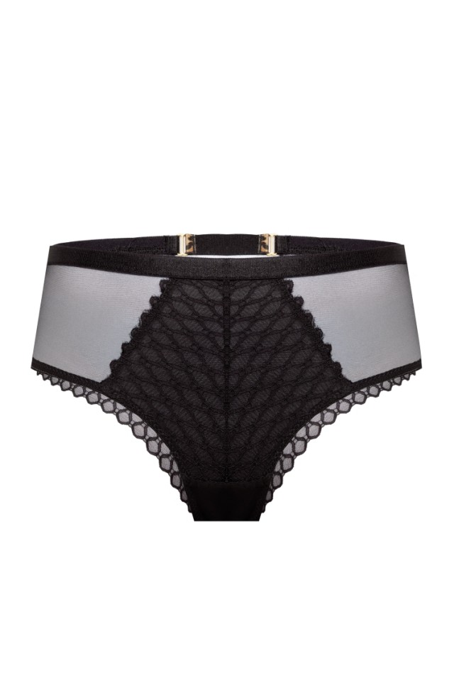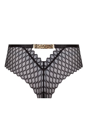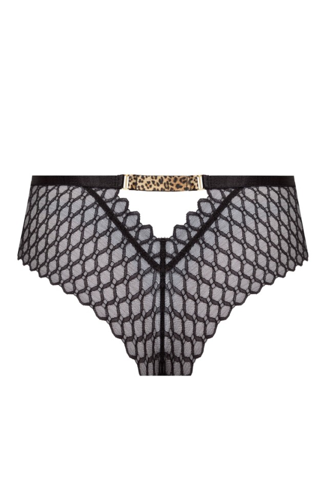 Трусики бразильяна Tristane с завышенной линией талии выполнены из кружевного полотна с фантазийным рисунком, спереди продублированы черной сеткой, по бокам вставки из черной сетки, на спинке V-образный вырез с резинкой с хищныым принтом, фурнирута металлическая цвета желтого золота, ластовица из 100% хлопка. Трусики идеально комплектуются с бюстгальтерами Tristane.