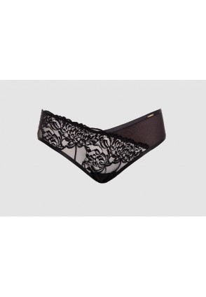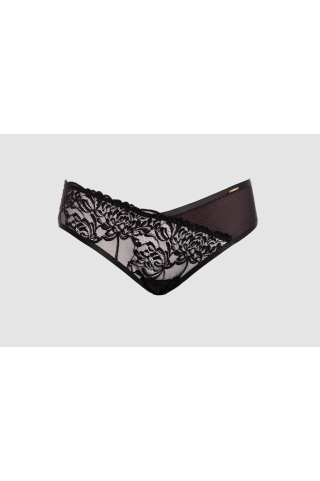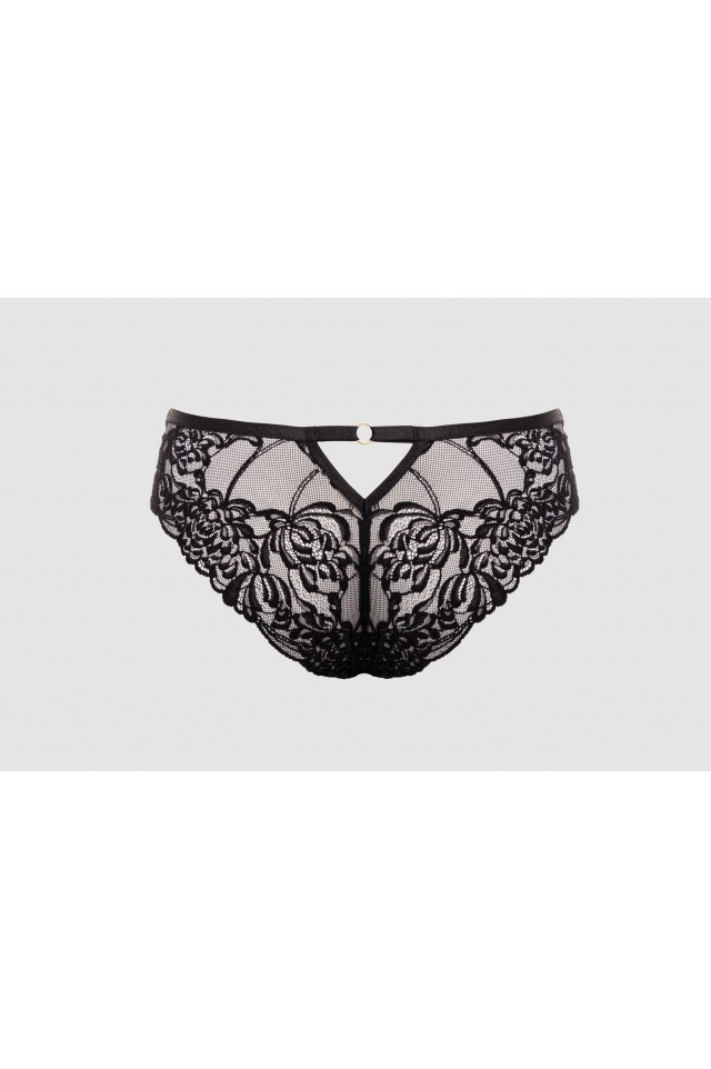 Трусики бразильяна из коллекции TruffleNoir выполнены из кружева, спереди вставка из черной сетки продублирована сеткой цвета трюфеля, на спинке V-образный вырез, фурнитура металлическая цвета желтого золота. Ластовица проложена 100% хлопком цвета трюфеля.