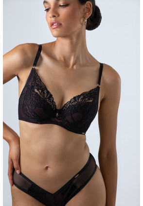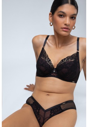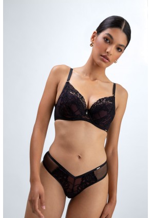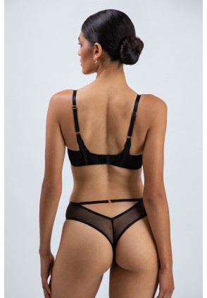 Трусики стринг из коллекции TruffleNoir выполнены из кружева и черной сетки, спереди продублированы сеткой цвета трюфеля, на спинке V-образный вырез, фурнитура металлическая цвета желтого золота. Ластовица проложена 100% хлопком цвета трюфеля.