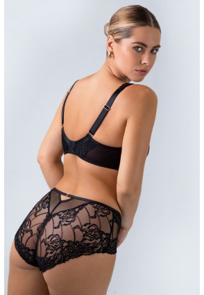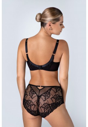 Трусики слип с завышенной талией из коллекции TruffleNoir выполнены из кружева, спереди вставка из черной сетки продублирована сеткой цвета трюфеля, на спинке V-образный вырез, фурнитура металлическая цвета желтого золота. Ластовица проложена 100% хлопком цвета трюфеля.