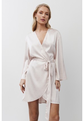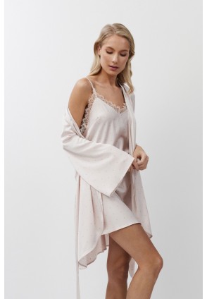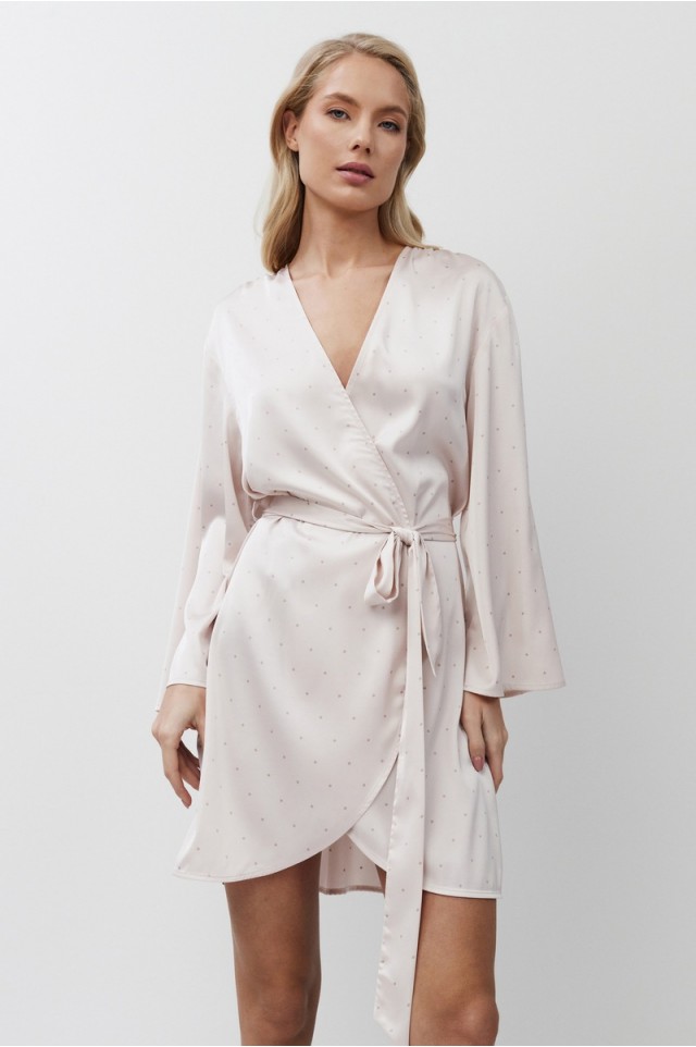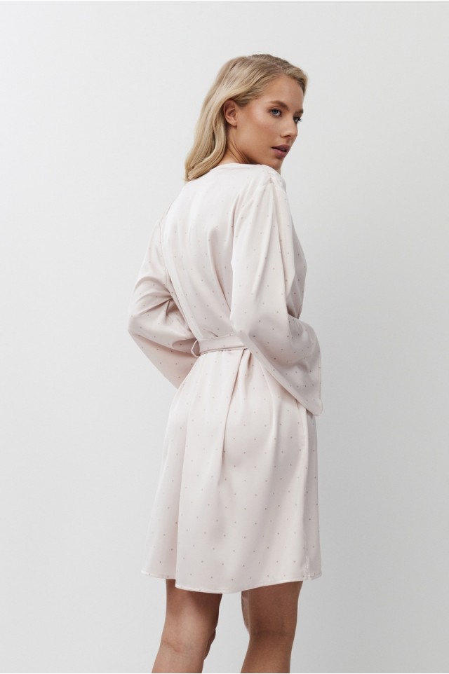 Короткий нежный женский халат GWEN для вашего комфорта. Халат выполнена из шелковистого сатина, на поясе, с закругленным низом, рукава свободные, V-образный верез декольте. Расслабьтесь с максимальным комфортом в халате GWEN.